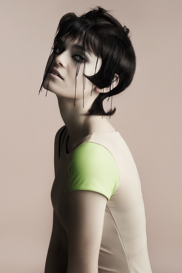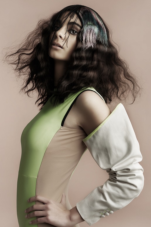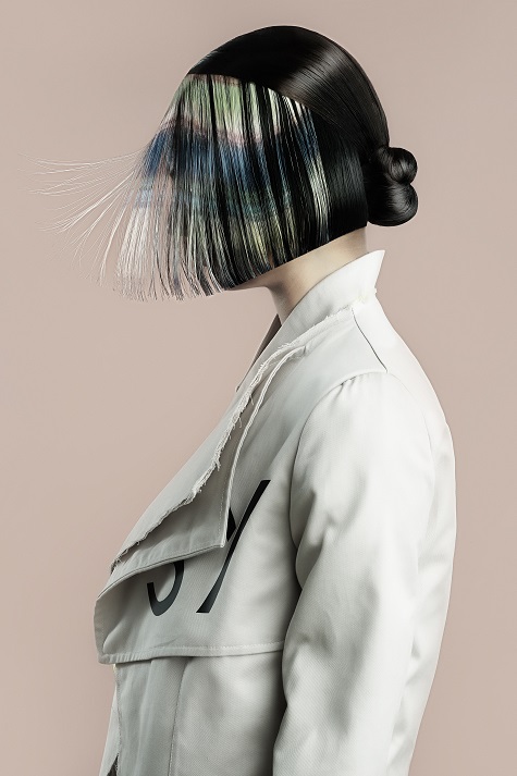 El color, como las texturas, irrumpen de repente, reproduciendo una impresión y tratando el cabello como un tejido.