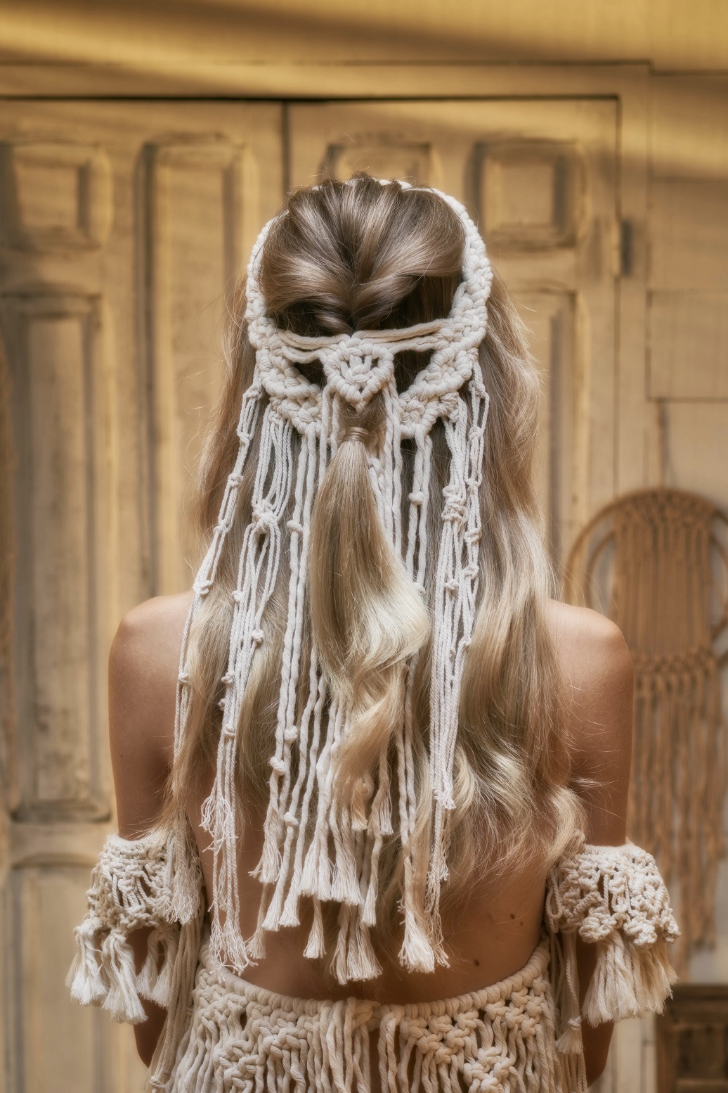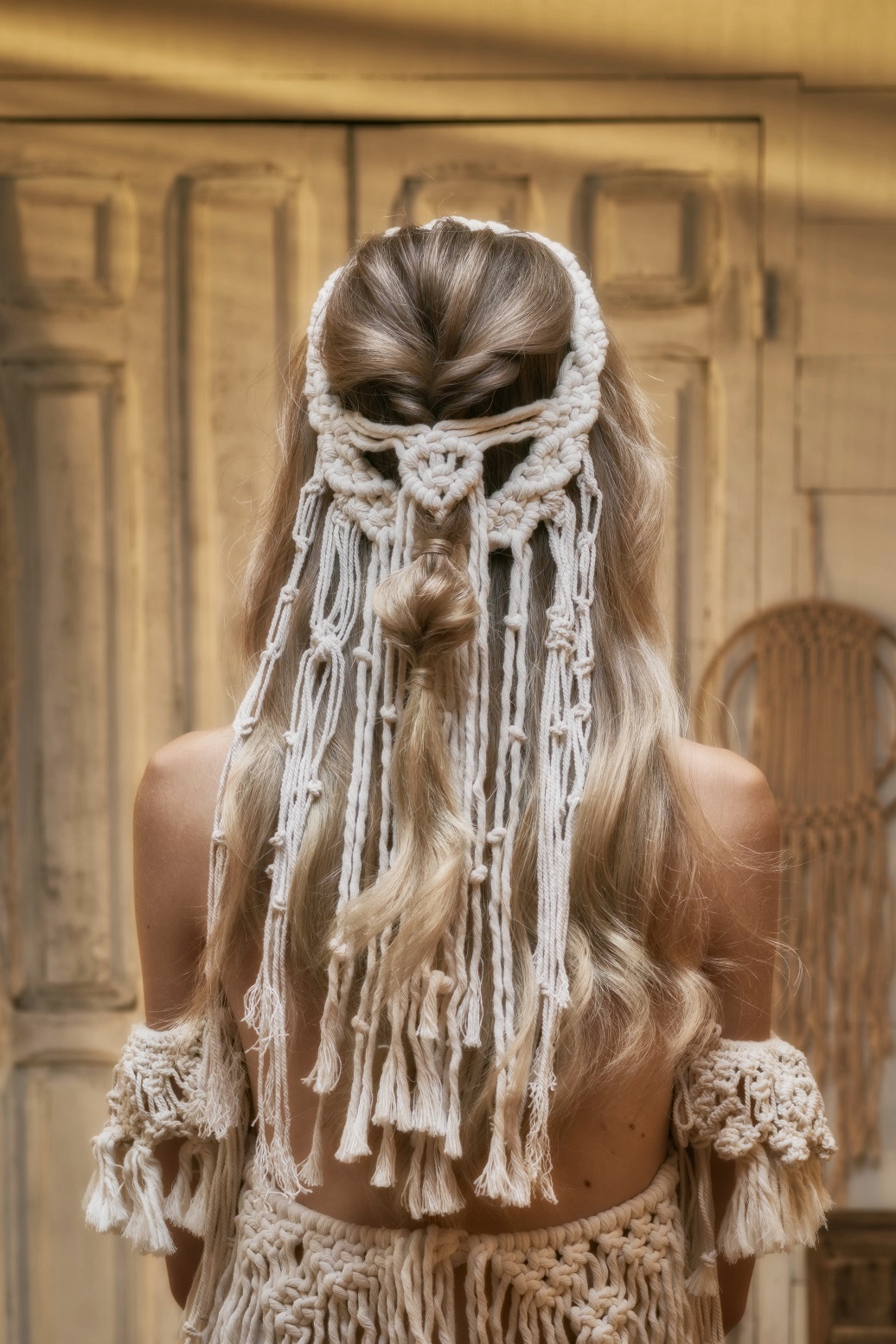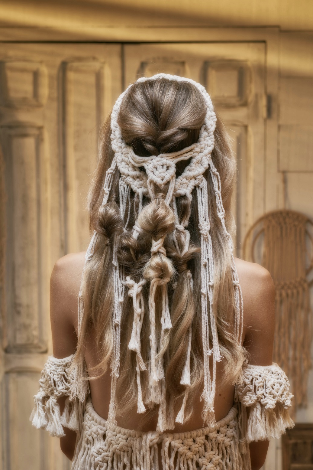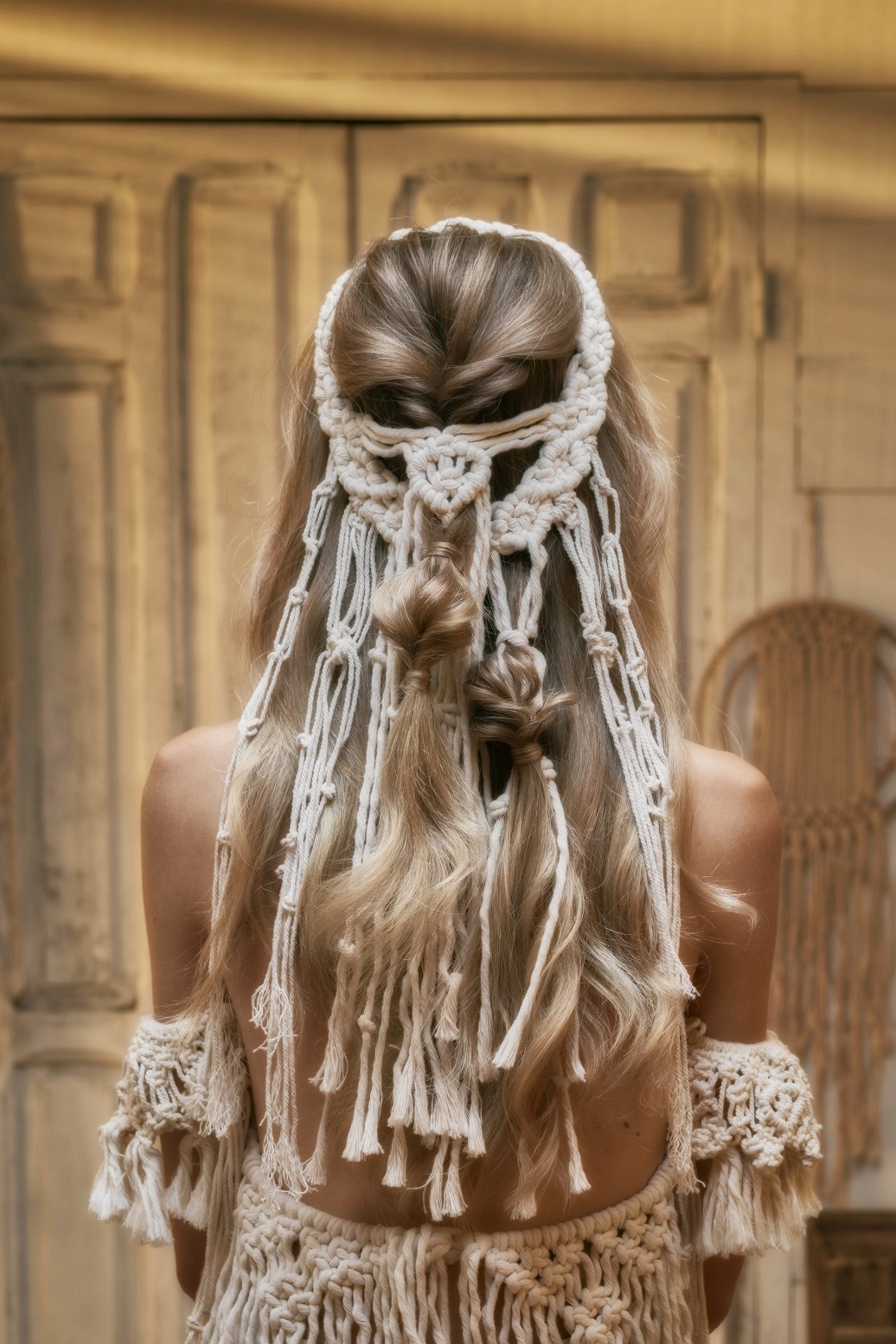 Introducir la coleta por el centro de la sección y sacar un poco de esponjosidad. Colocar alrededor de esta sección el tocado de macramé y asegurar su base con horquillas de presión. Después, tomar dos mechones, dejando en el centro los cordeles de macramé y hacer una coleta. Con un mechón, tapar la goma.