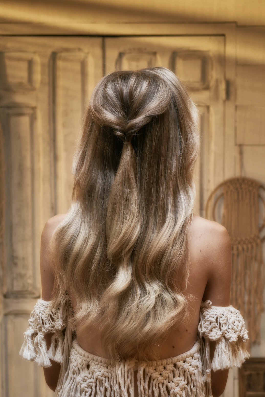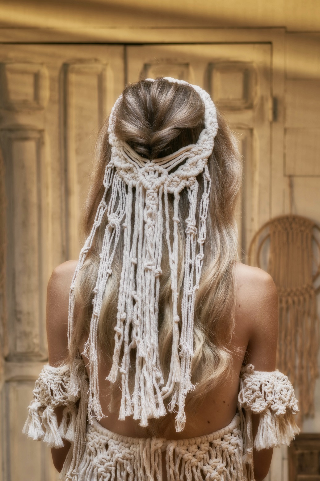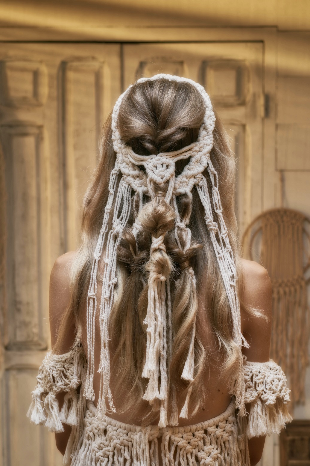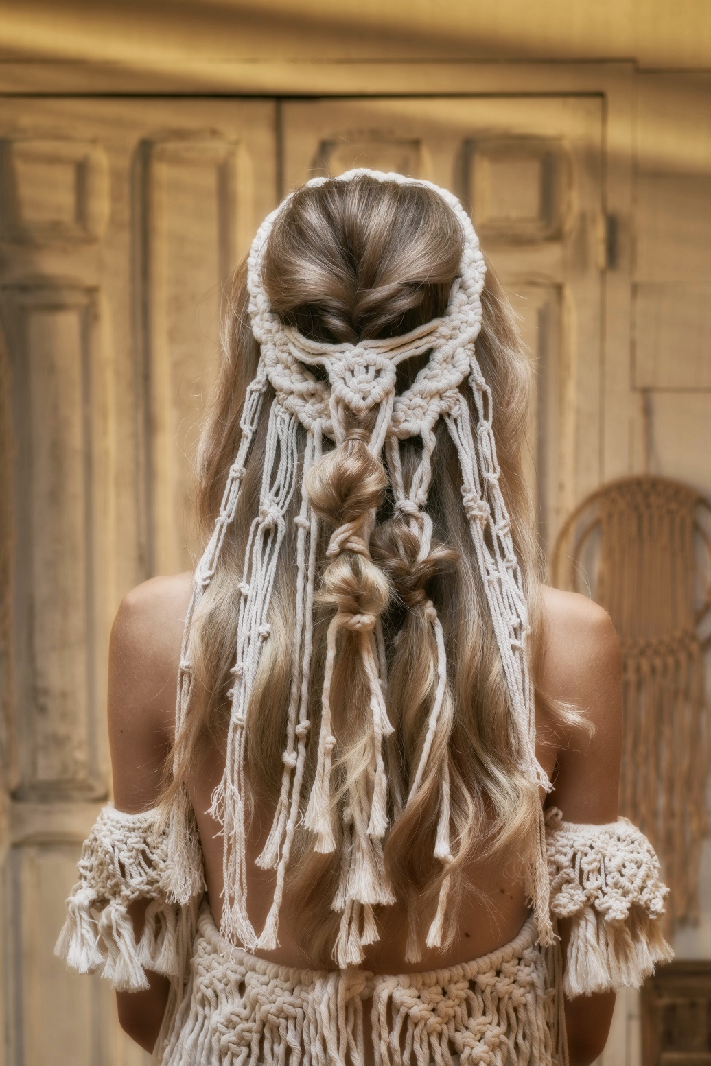 Introducir la coleta por el centro de la sección y sacar un poco de esponjosidad. Colocar alrededor de esta sección el tocado de macramé y asegurar su base con horquillas de presión. Después, tomar dos mechones, dejando en el centro los cordeles de macramé y hacer una coleta. Con un mechón, tapar la goma.