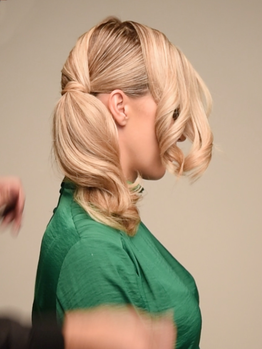 Paso 1: Dividir el cabello en tres secciones y formar una cola de caballo a un lado, justo detrás de la oreja.