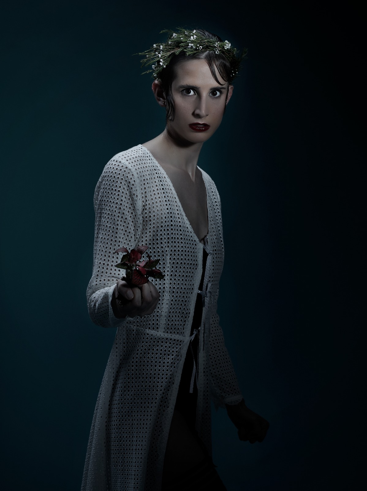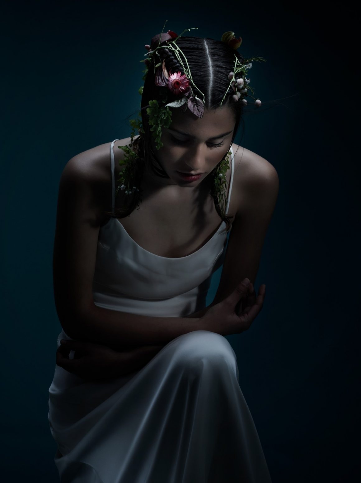 El cabello se funde con los detalles florales en la búsqueda de esa esencia, cae como una tupida cascada ondulada como si fuera un velo cargado de profundidad y se recoge con una estética que atrapa la tradición.