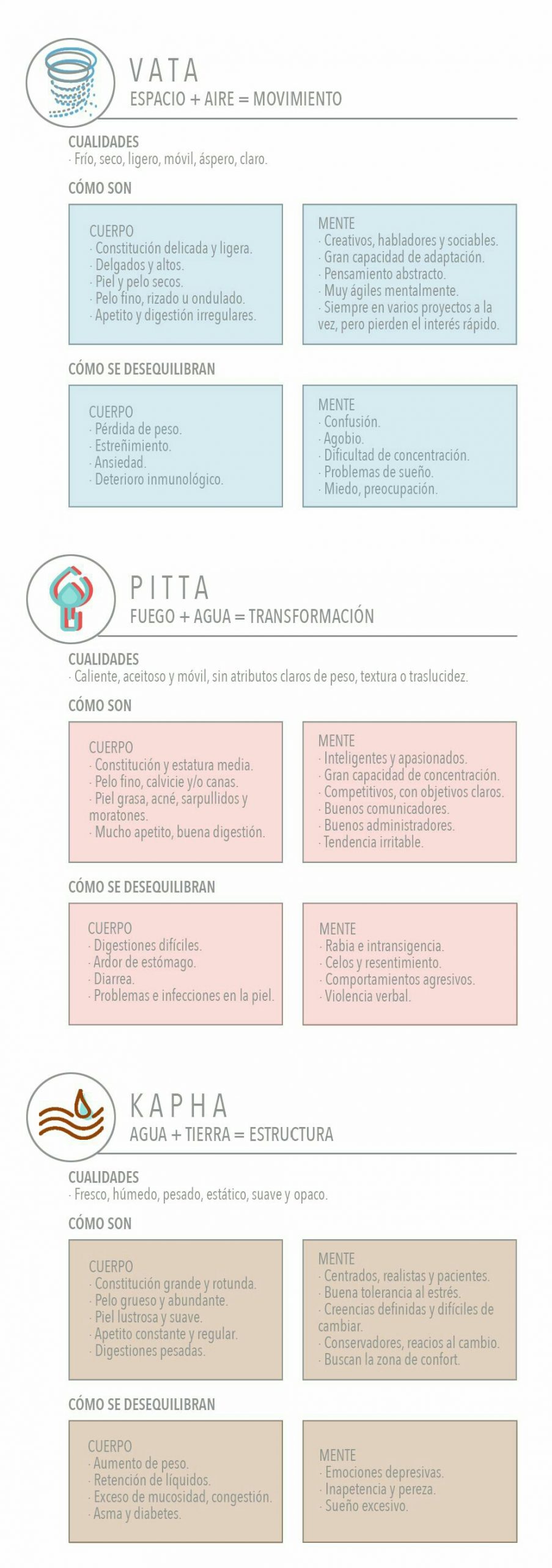 Si bien nos identificamos con uno de ellos en nuestra estructura, forma de ser, de actuar, de comer, pensar, etc., los otros dos están también presentes en nuestro ser, ya que Vata corresponde a todos nuestros humores, Pitta es metabolismo y Kapha es la estructura.